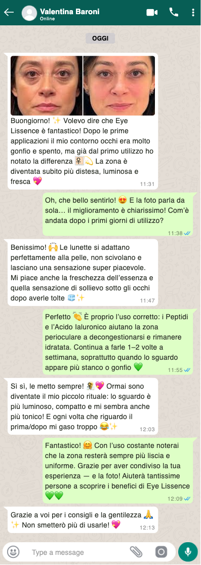 Eye Lissence è un trattamento cosmetico delicato, non invasivo e adatto a tutti i tipi di pelle, anche le più sensibili. Non promette miracoli, ma aiuta concretamente a ritrovare uno sguardo più riposato, levigato e radioso. Come per ogni trattamento naturale, i risultati possono variare da persona a persona: consiglio di applicare le lunette su pelle pulita e lasciarle agire per il tempo indicato per favorire un assorbimento completo dei principi attivi.