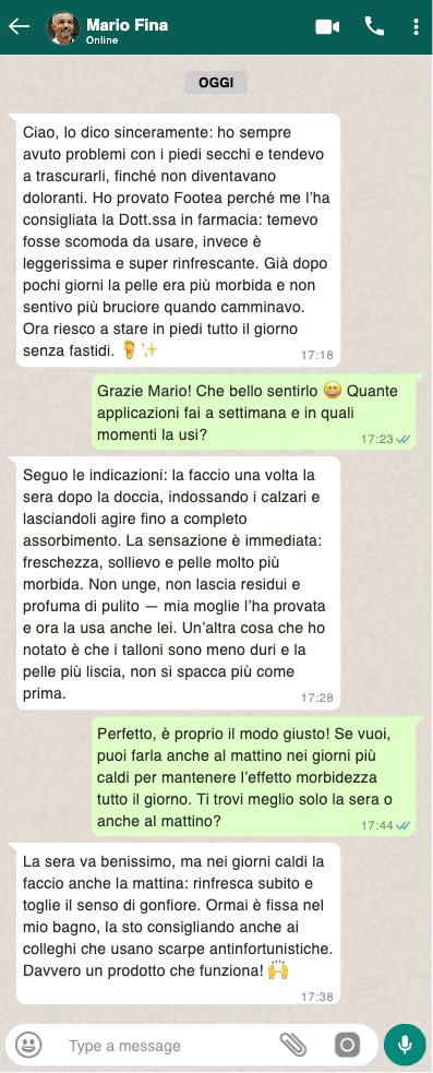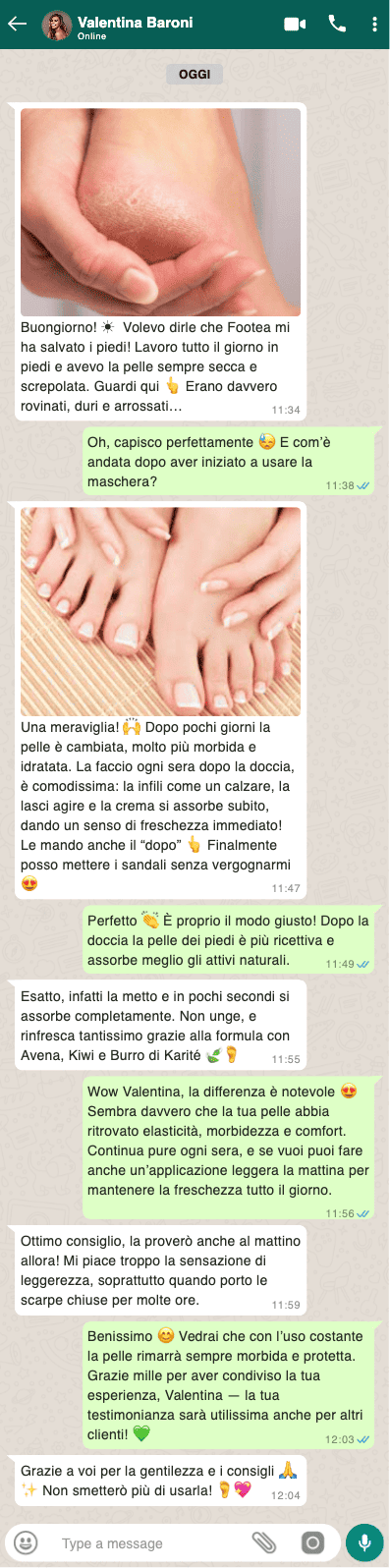 Come cosmetologa, vedo spesso routine errate per la cura dei piedi: prodotti troppo aggressivi, creme poco nutrienti o trattamenti che non riescono a penetrare a fondo la pelle ispessita. Footea è diverso: una formulazione bilanciata che sfrutta estratti naturali noti per la loro efficacia cosmetica — Avena per lenire, Kiwi per rivitalizzare e Burro di Karité e Olio di Mandorle Dolci per nutrire intensamente.