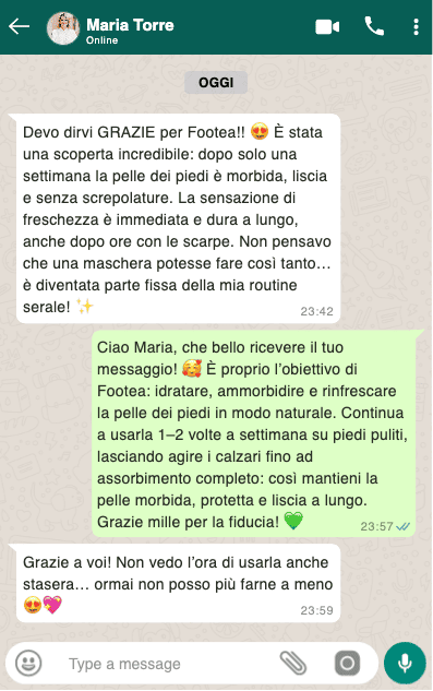 Footea è un trattamento cosmetico non invasivo, rapido e delicato, adatto a tutti i tipi di pelle. Non promette miracoli, ma aiuta concretamente a ritrovare benessere, idratazione e comfort dopo una giornata intensa o periodi di pelle particolarmente secca. Come per ogni prodotto naturale, gli effetti possono variare da persona a persona: consiglio di applicare i calzari su piedi puliti e lasciarli agire per il tempo indicato per favorire un assorbimento completo dei principi attivi.